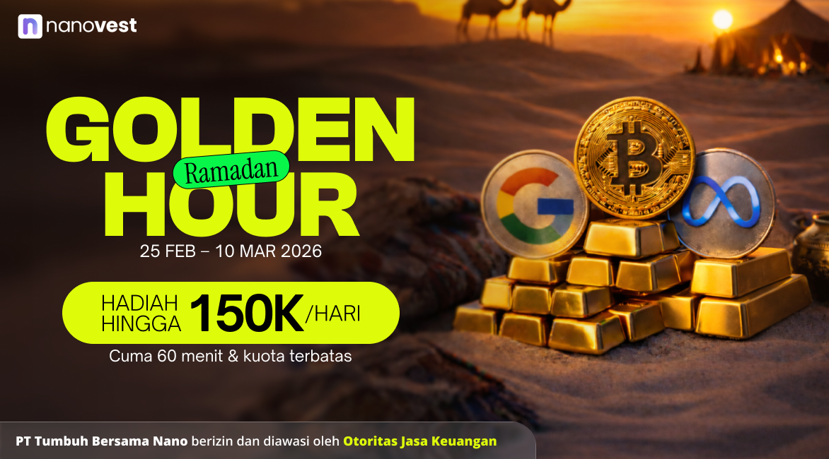 Sambut momen penuh berkah dengan Ramadan Golden Hour, program spesial dari Nanovest yang hadir pada 25 Februari – 10 Maret 2026. Melalui tiga sesi terbatas berdurasi 60 menit setiap hari (Golden Hour Saham, Kripto, dan Emas), pengguna berkesempatan meraih hadiah hingga Rp150.000 per hari hanya dengan menyelesaikan misi Top Up dan Transaksi. Dengan mekanisme hadiah berupa scratch card yang bisa langsung diklaim menjadi saldo, Ramadan Golden Hour menjadi momentum tepat untuk memaksimalkan aktivitas investasi sekaligus berburu reward selama bulan suci. Jangan lewatkan setiap jam emasnya dan pastikan kamu ikut sebelum kuota harian habis!