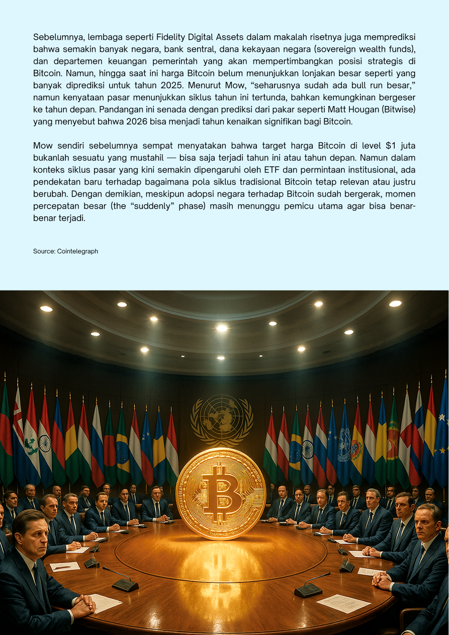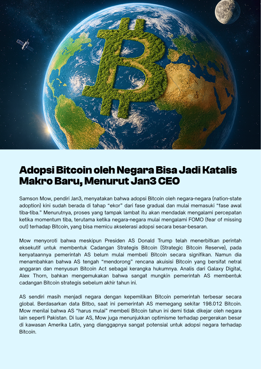 Namun di tengah tekanan tersebut, muncul katalis potensial dari sisi makro: adopsi Bitcoin oleh negara (nation-state adoption) yang kini mulai menunjukkan tanda akselerasi. Menurut Samson Mow, CEO Jan3, momentum “fase tiba-tiba” dalam adopsi Bitcoin antarnegara bisa menjadi pemicu besar bagi tren bullish berikutnya.
