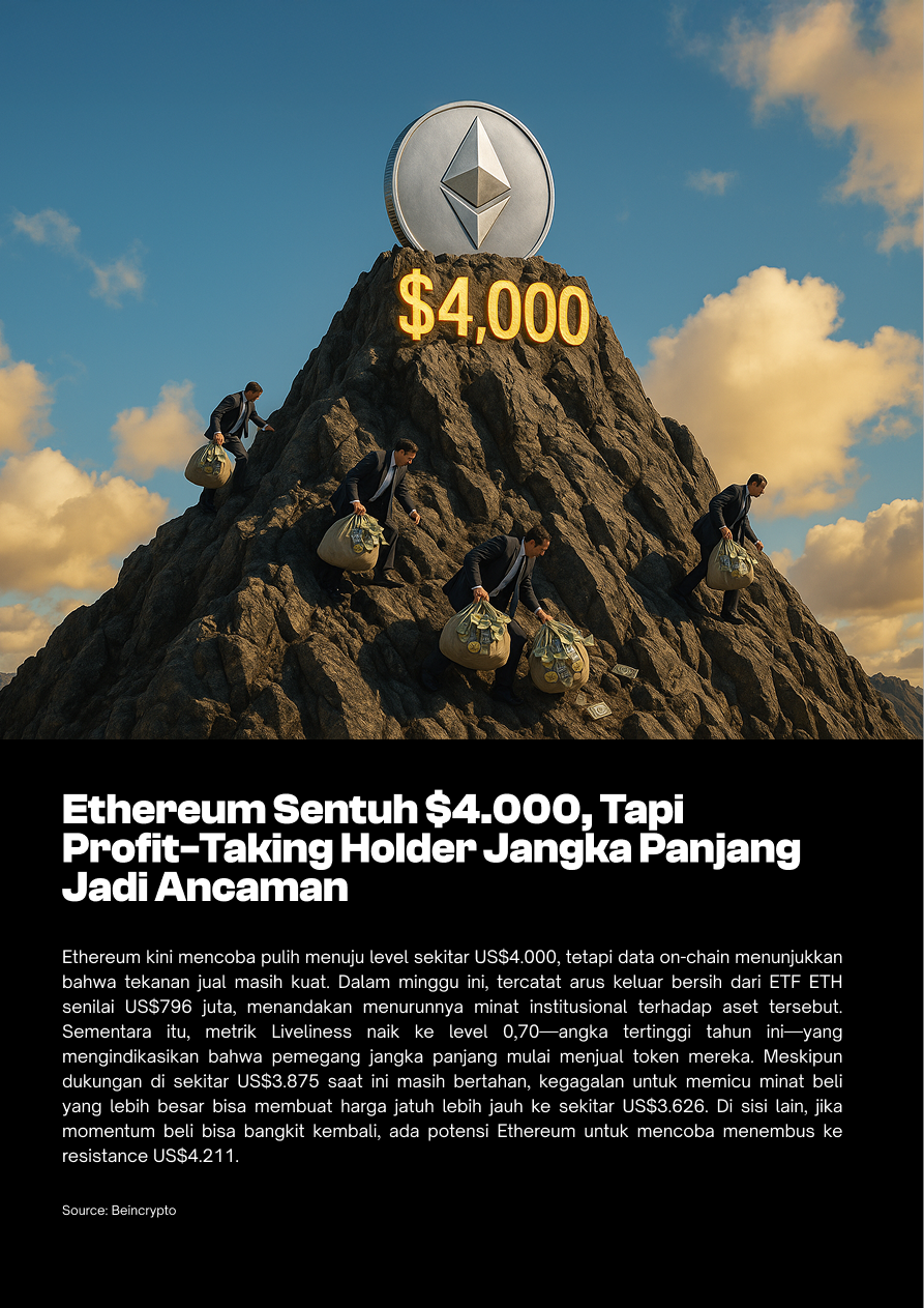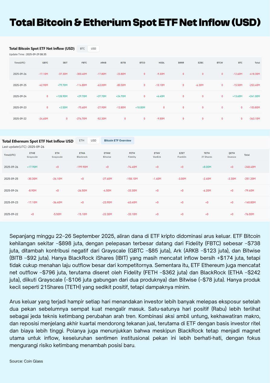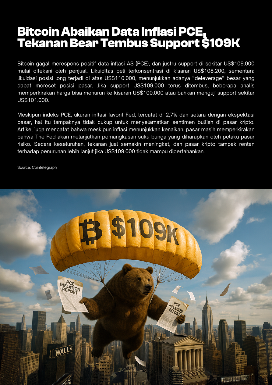 Tekanan jual kembali mendominasi pasar kripto pada awal pekan ini, menekan harga Bitcoin di bawah level psikologis US$109.000. Sentimen bearish tersebut dipicu oleh kombinasi aksi ambil untung, keluarnya dana besar dari ETF spot, serta lemahnya respons pasar terhadap data inflasi AS (PCE) yang sesuai ekspektasi.