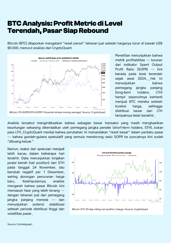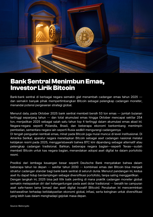 Pasar kripto memasuki awal Desember dengan tensi yang unik: di satu sisi tekanan jual Bitcoin mulai mereda seiring “reset” besar pada metrik profitabilitas, namun di sisi lain sentimen investor masih dibayangi kehati-hatian dari arus keluar ETF dan fluktuasi likuiditas dolar global. Di tengah fase konsolidasi ini, perhatian pasar mengarah pada perubahan struktural yang lebih besar mulai dari bank sentral yang agresif menimbun emas sambil mulai melirik Bitcoin sebagai aset cadangan alternatif, hingga langkah institusi memperluas eksposur ke infrastruktur blockchain lewat ETF seperti Chainlink.
