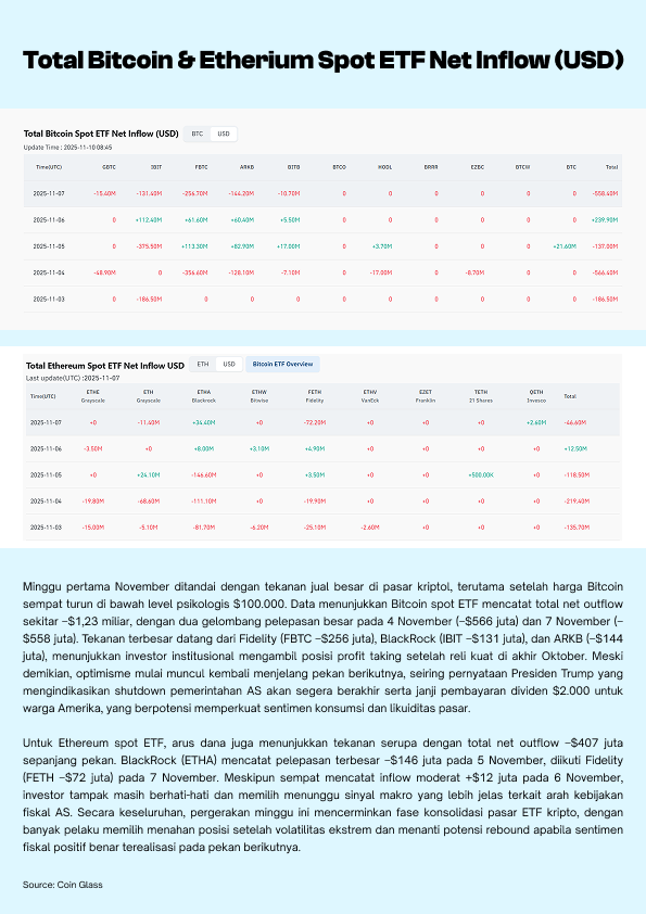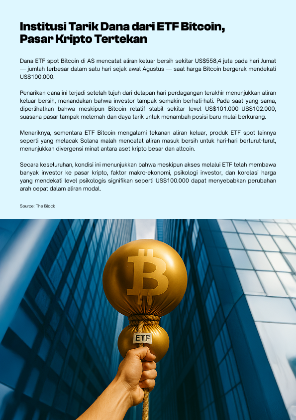 Pasar kripto memasuki pekan penuh tekanan setelah ETF Bitcoin spot di AS mencatat outflow jumbo yang mengguncang sentimen institusional. Meskipun harga BTC masih bertahan di kisaran psikologis US$100.000–US$102.000, investor besar tampak memilih mengambil untung dan mengurangi eksposur, sementara altcoin seperti Solana justru kedatangan aliran dana baru.