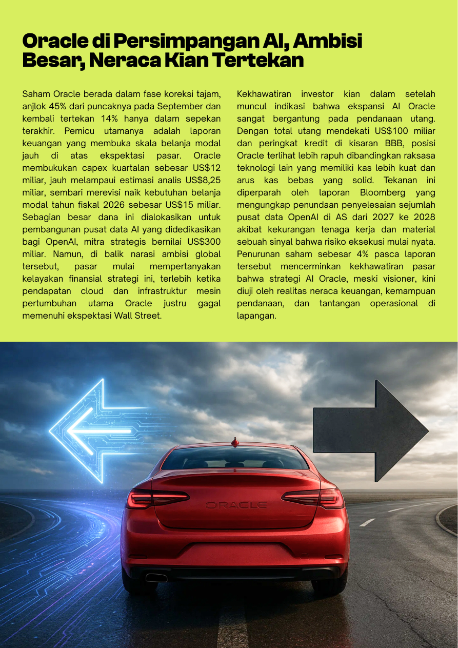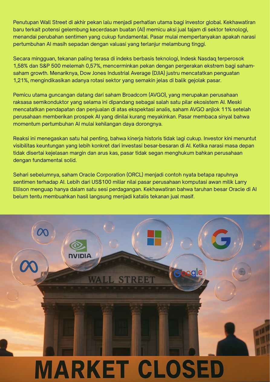 Wall Street membuka pekan ini dengan nada yang jauh berbeda dari beberapa bulan terakhir. Euforia kecerdasan buatan (AI) yang sebelumnya menjadi motor utama reli saham teknologi mulai menunjukkan tanda kelelahan, memicu koreksi tajam dan perubahan arah arus dana. Investor kini tidak lagi sekadar terpukau oleh narasi pertumbuhan masa depan, melainkan semakin selektif dan kritis terhadap valuasi, margin, serta keberlanjutan laba.