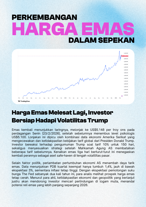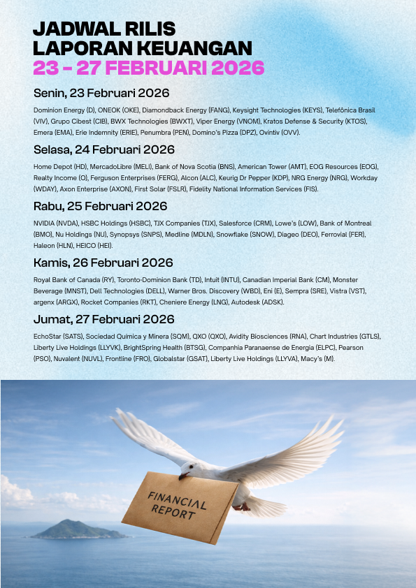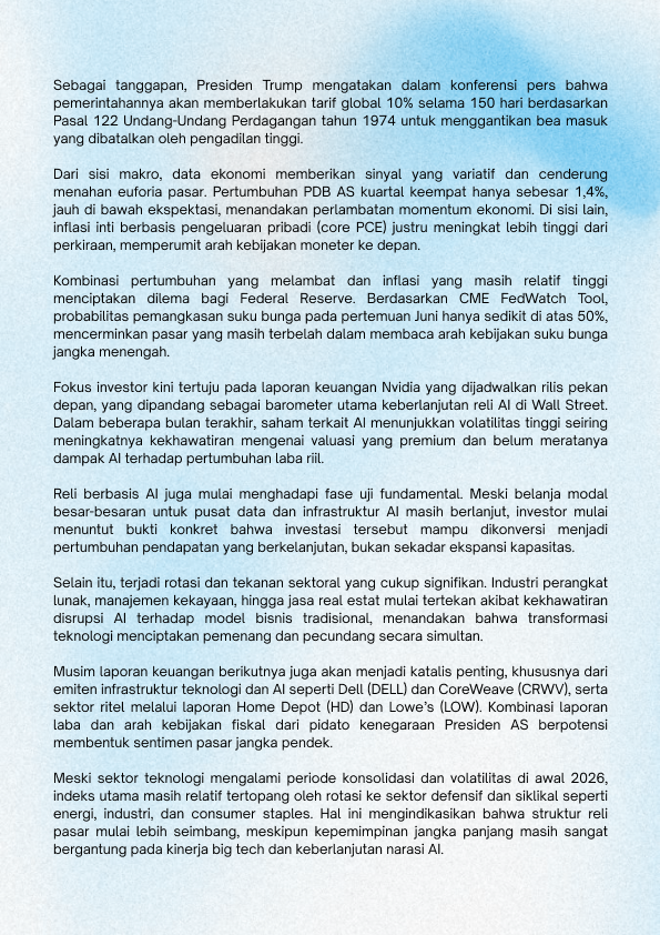 Wall Street menutup pekan dengan nada optimistis, tetapi bukan tanpa tanda peringatan. Sentimen risk-on memang kembali menguat, didorong oleh reli saham teknologi dan meredanya kekhawatiran perang dagang setelah keputusan Mahkamah Agung AS terkait tarif. Namun, di balik penguatan indeks utama, pasar mulai memasuki fase yang lebih selektif: pertumbuhan ekonomi melambat, inflasi masih lengket, dan reli berbasis AI kini menghadapi ujian fundamental yang nyata. Kombinasi faktor makro, kebijakan perdagangan, serta musim laporan keuangan yang krusial membuat pergerakan pasar pekan ini berpotensi tetap dinamis dengan investor semakin fokus membedakan antara hype dan pertumbuhan laba yang benar-benar berkelanjutan.