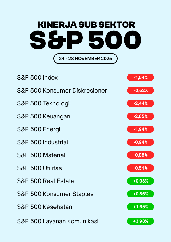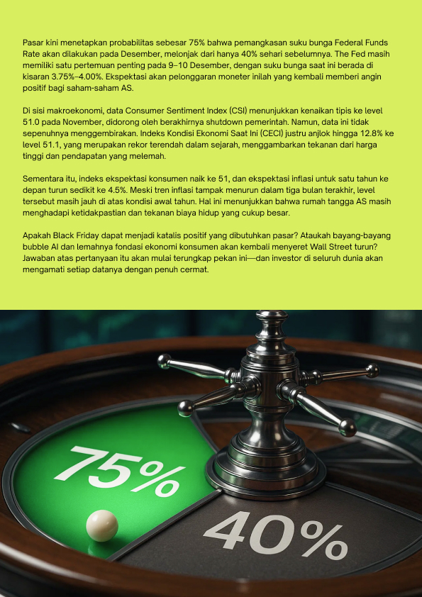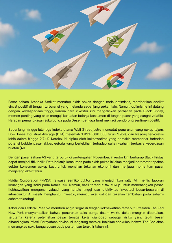 Tekanan koreksi di tiga indeks utama, volatilitas menjelang Black Friday, serta kekhawatiran bubble AI yang makin besar menjadikan sentimen minggu ini penuh dinamika. Investor kini berada di persimpangan antara peluang pemulihan jangka pendek dan risiko fundamental yang terus membayangi dari valuasi teknologi yang kian menanjak hingga sinyal ekonomi konsumen yang melemah.